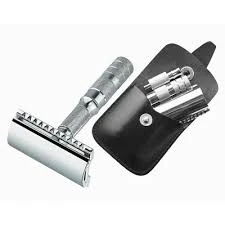This stainless and anodised aluminium safety razor can use Merkur, Parker or Astra blades. Great safety razor to take on your travels.